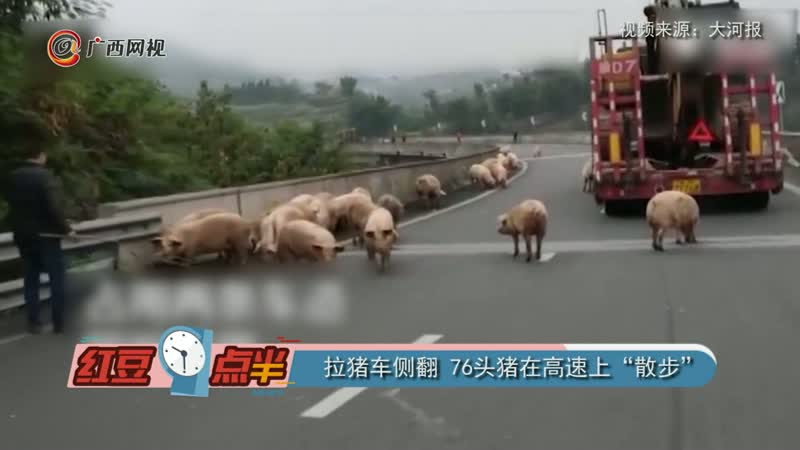 拉猪车侧翻 76头猪在高速上“散步”