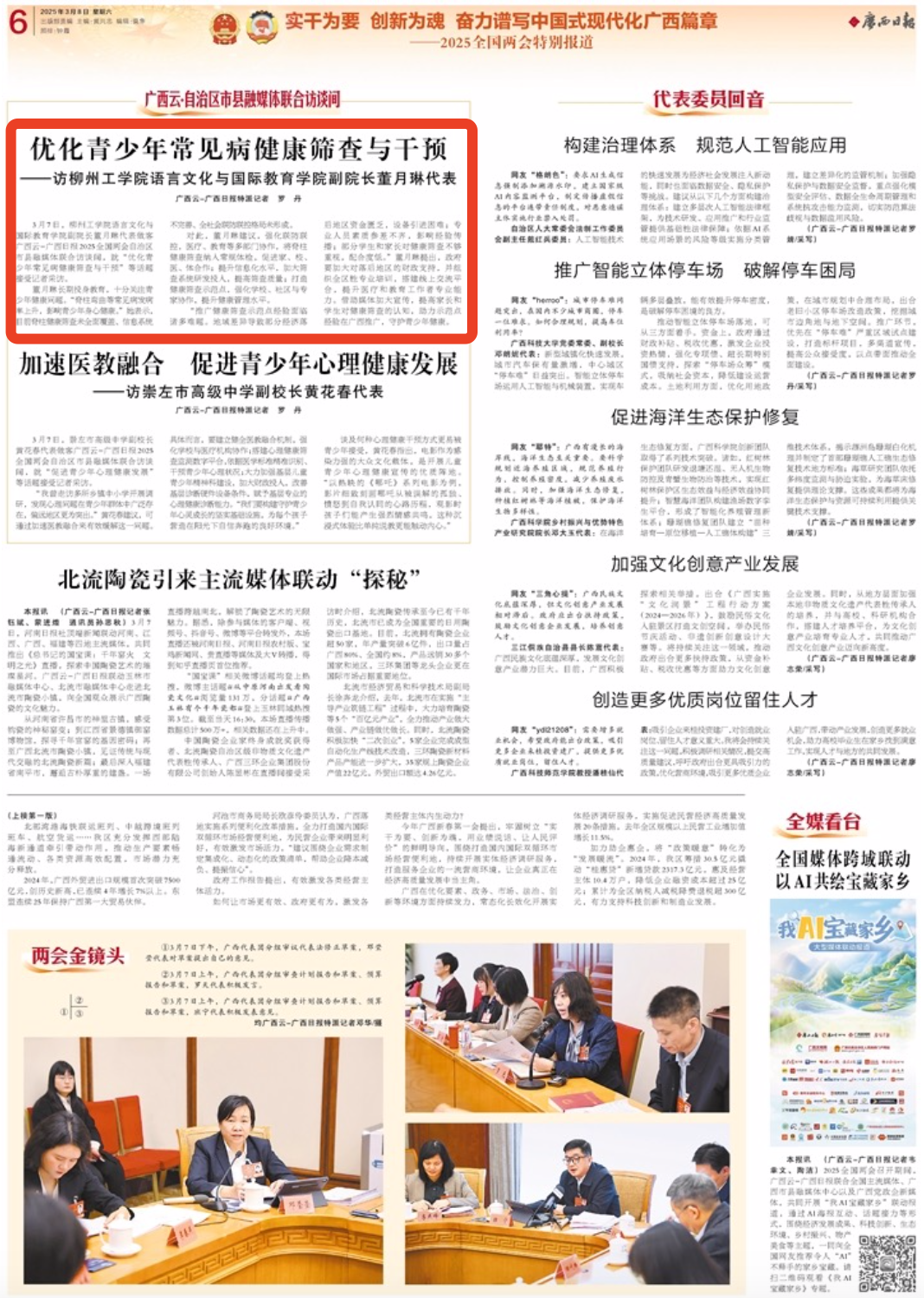 3月7日,节目迎来全国人大代表,柳州工学院语言文化与国际教育学院副院长董月琳,就“优化青少年常见病健康筛查与干预”相关话题进行访谈。