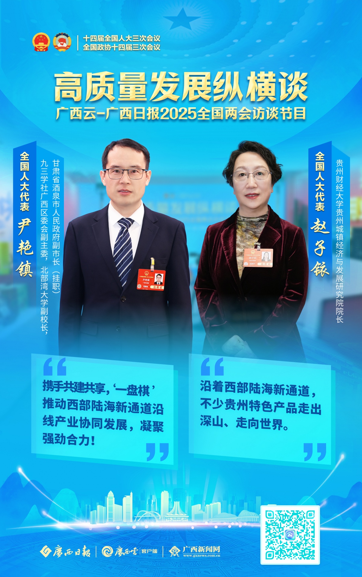 广西云-广西日报主持人:尹代表,我们也注意到,您去年挂职甘肃省酒泉市人民政府副市长,广西和甘肃都是西部陆海新通道的重要枢纽、关键节点,肩负着推动区域协同发展的重要使命。您觉得西部陆海新通道沿线省份如何携手实现跨区域合作,推动贸易便利化呢?